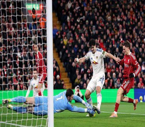 2天后要奔赴倫敦連戰(zhàn)富勒姆和阿森納,面對客場防守稀松的利茲聯(lián)(此前客場比賽全部有丟球),斯洛特繼續(xù)將小傷在身的維爾茨放在了前場偏左的位置,畢竟上輪對壘狼隊,德國人就在這個角色上干得不錯。開場階段,維爾茨和?;倏说暮魬?yīng)也的確不少,法國前鋒首次射正被盧卡斯·佩里撲出后,第二次內(nèi)切選擇找到小禁區(qū)邊緣的維爾茨,但后者跟進(jìn)推射被封堵。眼見客隊三中衛(wèi)守得腹地密不透風(fēng),利物浦由瓊斯等人逐漸增加外圍發(fā)炮,孰料本方禁區(qū)卻險些被偷襲得手。阿利松幾乎沒有難度的出球直接送到安帕杜腳下,好在后者也沒做足射門準(zhǔn)備,掄了一腳也是回傳力度。
