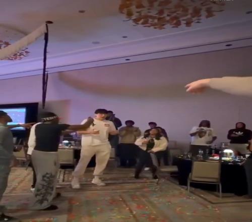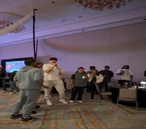 按照NBA的傳統(tǒng),新秀樂福領(lǐng)唱生日歌,楊瀚森同為新秀也在一旁跟著唱。