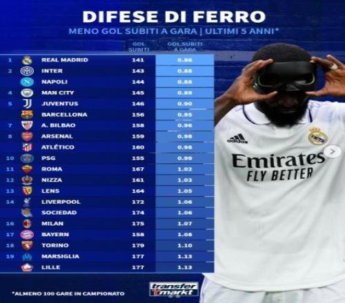 近5年五大聯(lián)賽場均失球最少榜:皇馬0.86球第1,國米0.88球第2